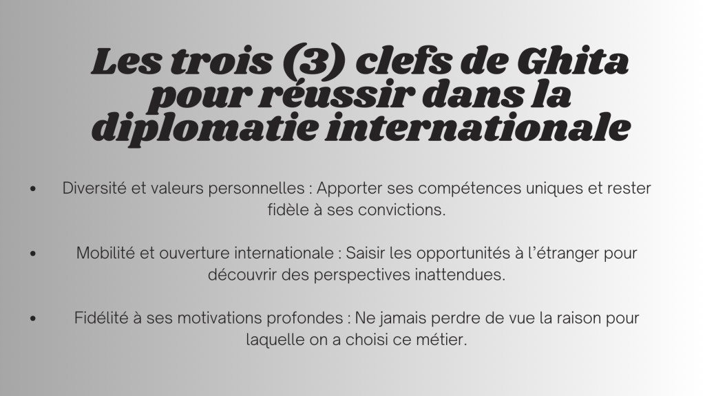 Pour les jeunes étudiants, chercheurs ou professionnels issus de la diaspora, Ghita recommande d’aller vers la diversité et l’innovation, car le système international a besoin de nouvelles compétences et expériences. Elle encourage également à saisir les opportunités de mobilité, car travailler à l’étranger permet de découvrir des opportunités invisibles au départ. Enfin, elle insiste sur l’importance de rester fidèle à sa motivation initiale et de ne jamais perdre de vue les raisons qui poussent à rejoindre les affaires internationales.
